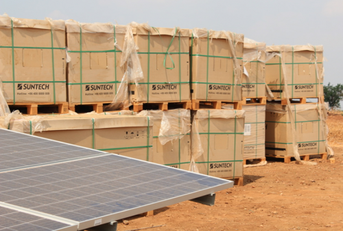 除了一些太陽能電池陣外,還有一大堆裝有尚德標(biāo)志的盒子。這些模塊正在休息,不久將在本月內(nèi)運(yùn)送到英雄在該州建立的400兆瓦其他光伏容量。