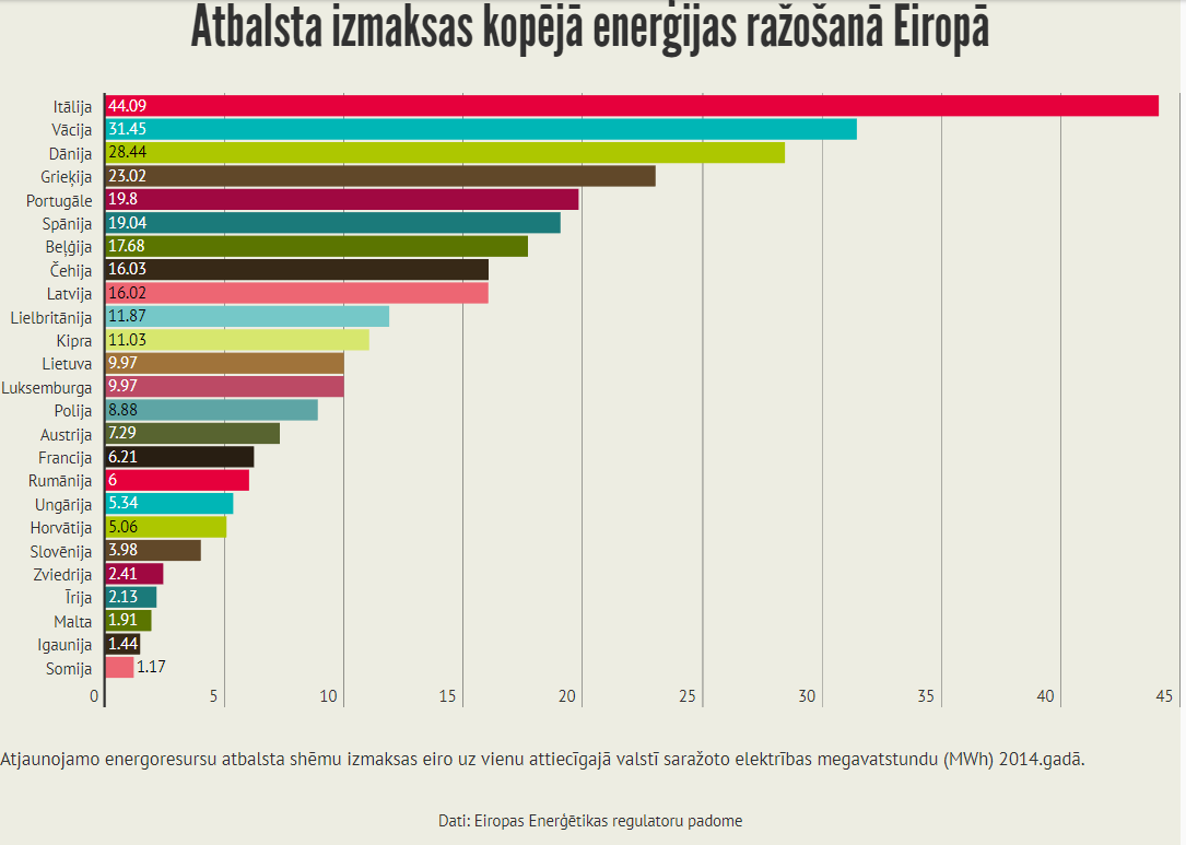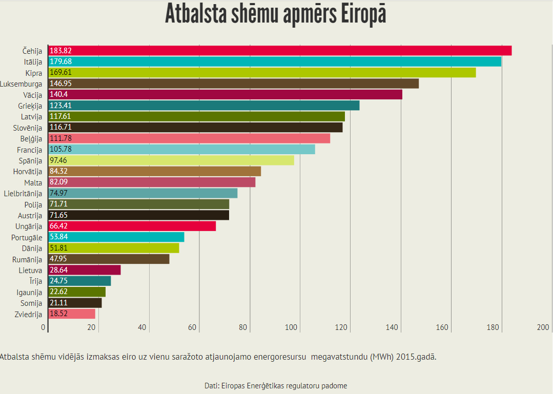 歐洲能源監管委員會(CEER)去年完成了一項關于歐洲支持機制的重要研究。對2014年和2015年的數據進行了分析,總體結論是:援助計劃為歐洲電力消費者帶來巨大成本。歐洲綠色能源生產商在2015年收到的超過批發價格的平均成本為每兆瓦時110歐元(MWh)。最高的付款是在捷克共和國,意大利和塞浦路斯。在拉脫維亞,支付額也超過了歐洲的平均水平。反過來,最低溫室氣體補充劑在瑞典。
