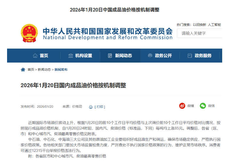1月20日24時(shí)起中國(guó)汽、柴油價(jià)格每噸均上漲85元